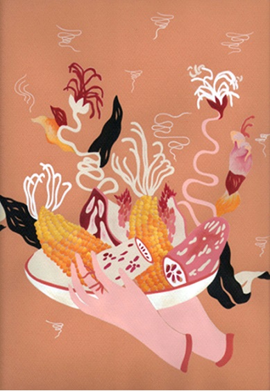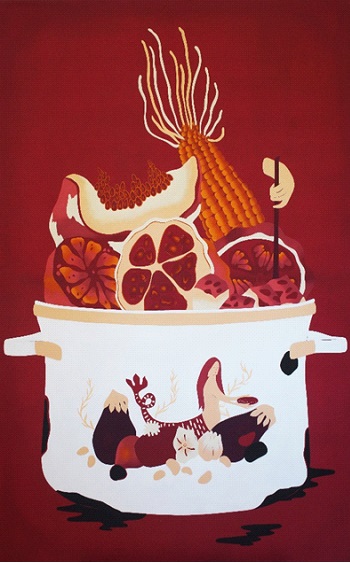 Desde este ángulo de visión, procuro una interpretación sobre la serie “Ofrendas”, de Carla Colombo, un conjunto de piezas cerámicas, pinturas e impresiones [3]. Las exuberantes formas orgánicas protagonizan un banquete para la mirada donde se cultiva una experiencia estética bellamente politizada. En una primera instancia sus obras pueden parecer banales, livianas, demasiado equilibradas en su composición, excesivamente hermosas. Se hace inevitable detenerse, dejarse afectar por la vibración de los colores, cuyas tonalidades pasean entre el más leve rosado, el naranja furioso y el púrpura saturado; ¿cómo no perderse recorriendo las formas voluptuosas y la línea sensible que contornea cuidadosamente cada figura? La proximidad se vuelve necesaria y se genera una intimidad contemplativa; una nota cómo los vegetales esconden formas humanas, que las sirenas redondeadas habitan junto a monstruos, que en algunas ollas se cocinan secretos, que lo sórdido y lo sutil suelen convivir de manera ominosa. Sus imágenes seducen y, agazapadas, penetran la carne tierna de un corazón sensible. Ante sus obras, la imaginación reverdece, crece como el tercer paisaje de un terreno baldío [4]. Al mismo tiempo, e inadvertidamente, diseña la ocasión para introducir lo incómodo, como una puñalada traicionera al centro del poder. Pertrechada con delicadeza, dedicación y convicción, crea ficciones que convocan memorias y generan convivencia entre saberes del más acá con reflexiones militantes. Como hilos de un ovillo interminable, cada forma puede estimular nuestra imaginación para desentrañar una historia que es la de tantas. La artista, anfitriona de una ceremonia en la cual hace suya la lengua legitimante de la belleza, nos habla también de un mundo inquietante y doloroso. Sin embargo, sus declaraciones no son pesimistas; ella sabe que, cuando la realidad abruma, gozar es el combustible necesario para poner en funcionamiento la transformación. Cual hierba silvestre que encuentra caminos para desbaratar el cemento, su estrategia artística capea simbólicamente el devaluado paisaje cotidiano de violencia hegemónica, siempre capitalista y patriarcal. Sus creaciones trazan caminos, atan cabos y construyen puentes con otras subjetividades: saben tejer redes, ya no sólo para la supervivencia sino también para la alegría.